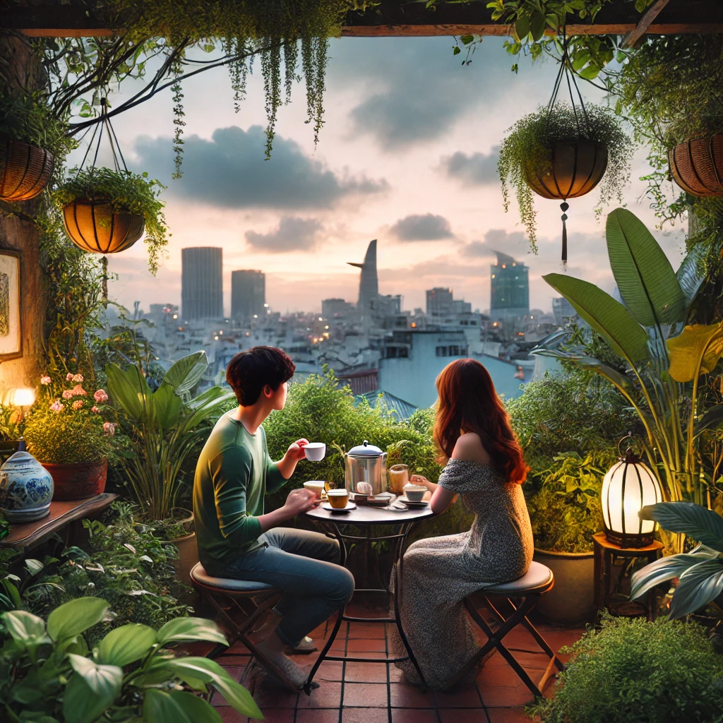 루프탑에 위치한 전통 베트남 스타일의 카페로, 푸른 식물들과 전통적인 인테리어가 조화를 이루는 독특한 분위기를 자랑합니다.