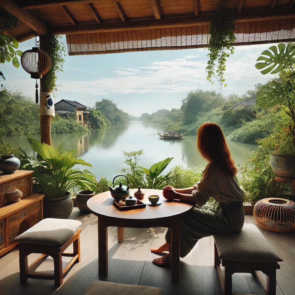 호이안 강변에 위치한 조용한 힐링 카페로, 자연과 어우러진 풍경이 인상적입니다.