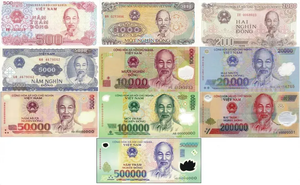 지폐는 500동, 1,000동, 2,000동, 5,000동, 1만 동, 2만 동, 5만 동, 10만 동, 20만 동, 50만 동의 총 10종류가 있습니다.
