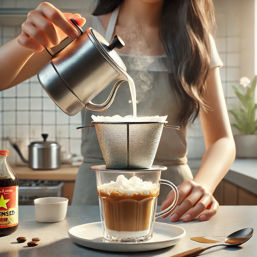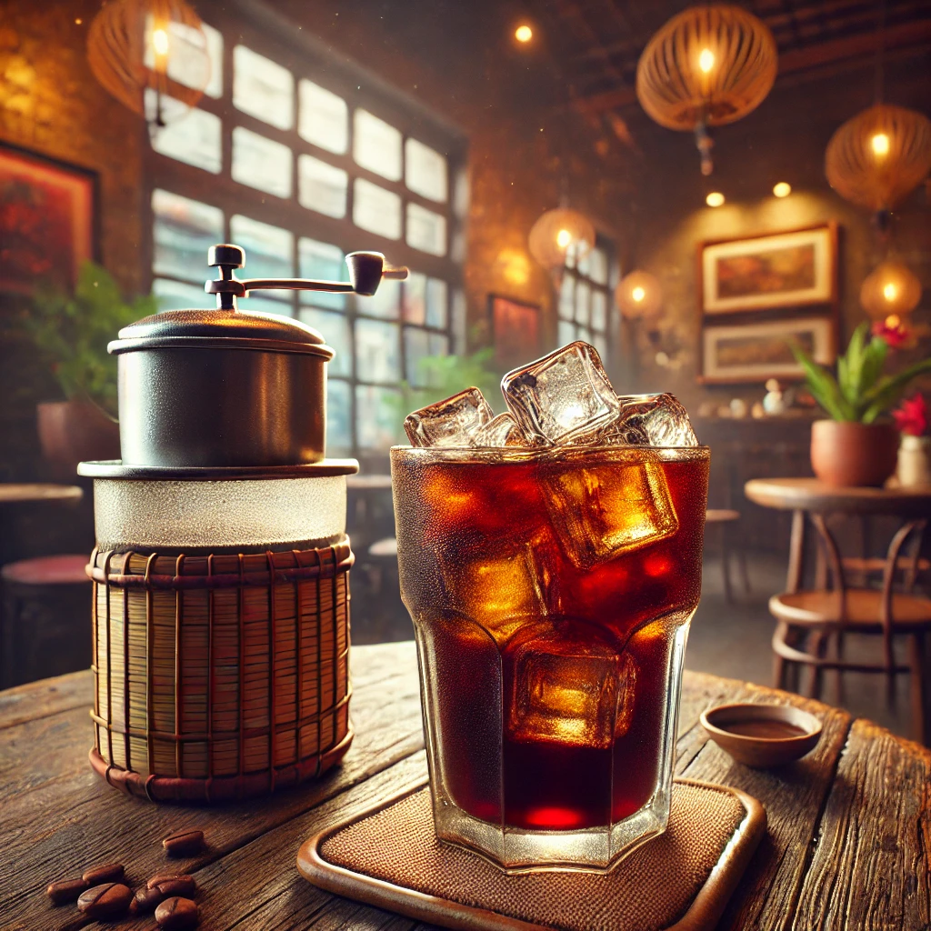 제조법: 전통적인 핀(Phin) 필터를 사용해 천천히 커피를 추출한 후 연유를 섞고 얼음을 더합니다.