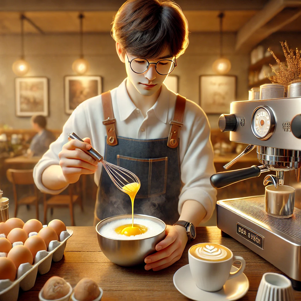 만드는 법: 달걀 노른자와 설탕을 거품 낸 후, 연유와 커피를 섞어 부어줍니다.